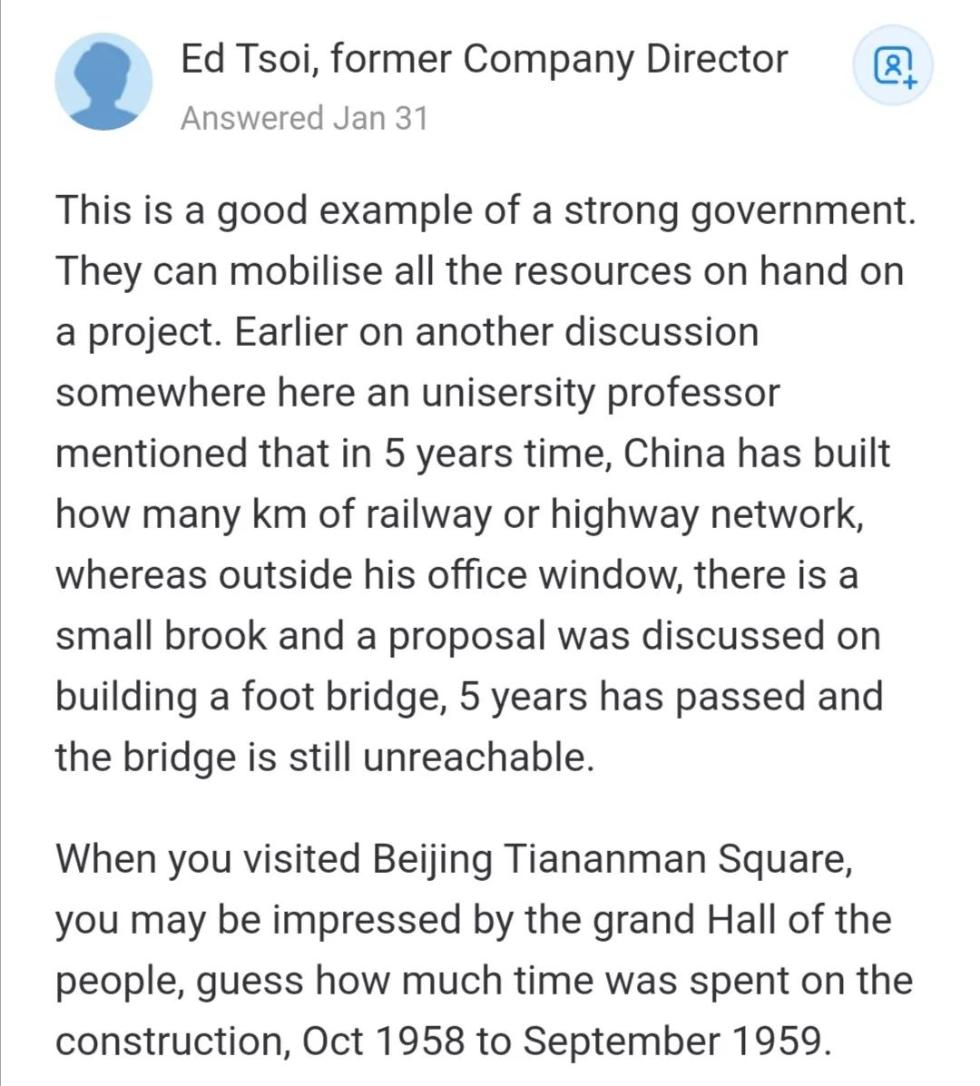 ? 这说明了什么是一个强有力的政府,有能力调度手中的一切资源保证项目实施的能力。 前段时间,一个大学教授也提出了类似的问题:五年时间里中国建好了若干条铁路和高速路,而同样的5年,由于教授办公室外有一条溪流,所以建不建桥还在讨论,工程一直搁浅。