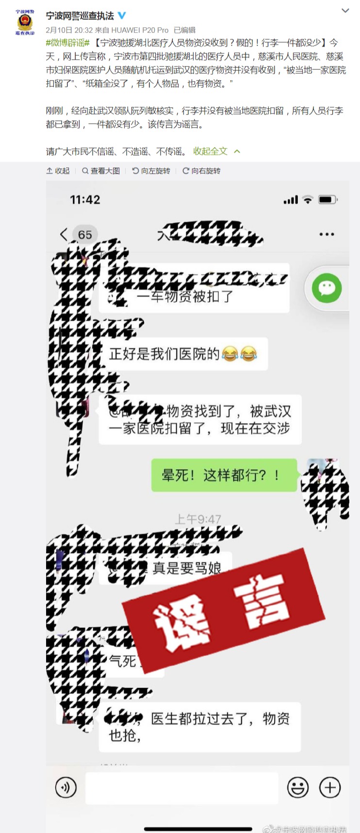 中新网2月11日电 10日,网上传言称,宁波市第四批驰援湖北的医疗人员中,慈溪市人民医院、慈溪市妇保医院医护人员随航机托运到武汉的医疗物资并没有收到,“被当地一家医院扣留了”、“纸箱全没了,有个人物品,也有物资。”