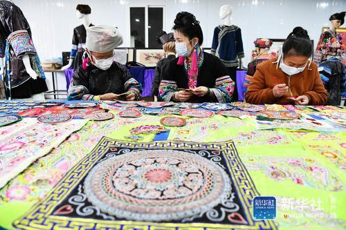 3月30日,在从江县贯洞镇,贵州省孔明苗侗民族绣品服务有限公司的工人在扶贫车间生产民族绣品。新华社记者 杨文斌 摄