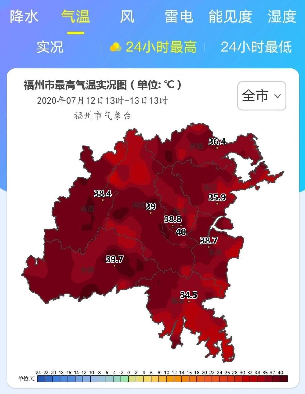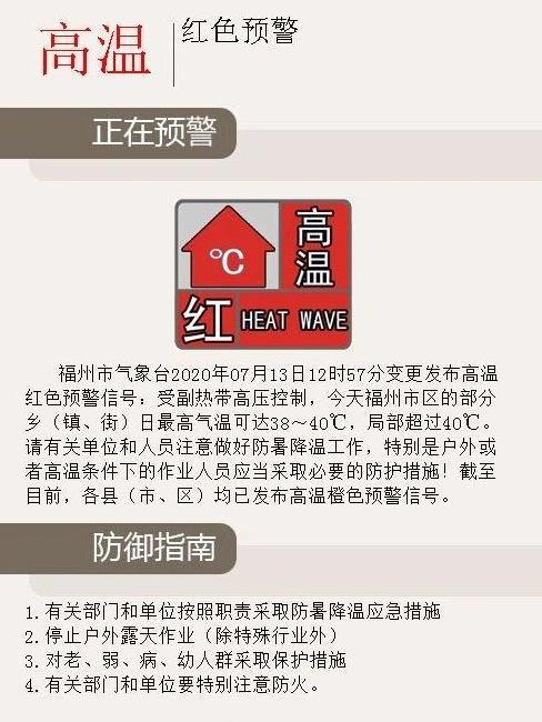 福州市气象台7月13日12时57分,发布今年首个高温红色预警信号:受副热带高压控制,今天福州市区的部分乡(镇、街)日最高气温可达38~40℃,局部超过40℃。请有关单位和人员注意做好防暑降温工作,特别是户外或者高温条件下的作业应采取必要的防护措施。