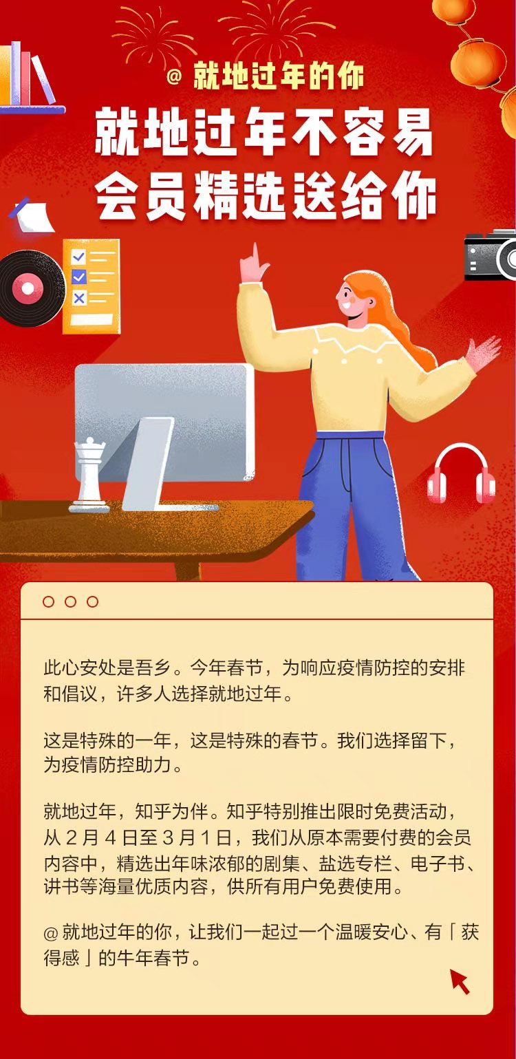 中国青年网北京2月5日电 今年春节,响应疫情防控的安排和倡议,许多人选择就地过年。为丰富群众的文化生活,互联网内容平台知乎,积极履行社会责任,精选上千部付费内容,免费提供给所有用户,为用户送上温暖安心、有“获得感”的牛年春节。