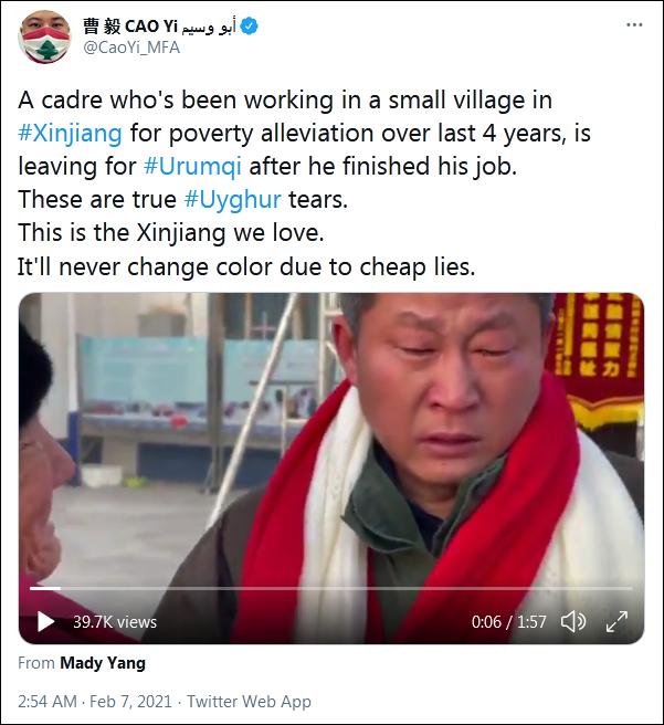 “这才是真正的维吾尔族的眼泪。”2月7日,中国驻黎巴嫩大使馆领事部主任曹毅在推特贴出一条视频。