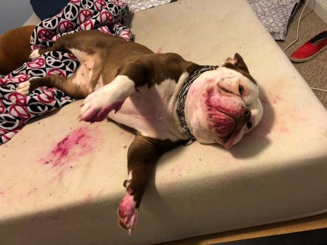 据英国《都市报》2月7日报道,近日,美国一只名叫Alice的斗牛犬偷吃了口红,主人Jordan Gilletti发现时,狗狗浑身都是红色,一动也不动,可把她吓坏了。