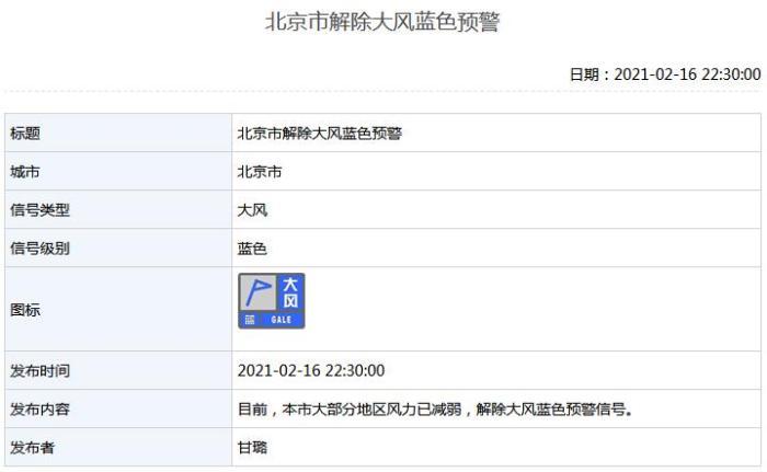据北京市气象局网站消息,目前,北京市大部分地区风力已减弱,北京市气象台16日22时30分解除大风蓝色预警信号。