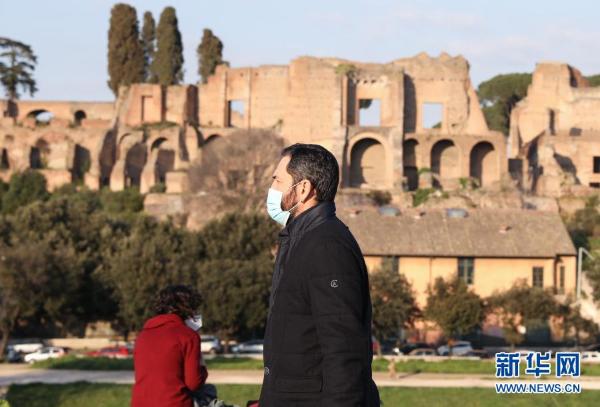 3月4日,一名男子戴着口罩走在意大利罗马街头。