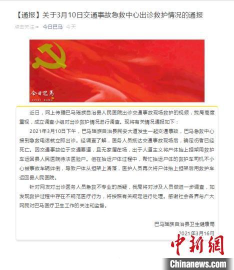 通报称,2021年3月10日下午,巴马瑶族自治县民安大道发生一起交通事故,巴马急救中心接到急救电话就立即出诊。经调查了解,医务人员抵达交通事故现场后,确定伤者已经死亡。因交通事故位于交通要道,且无家属在场,出于人道主义将尸体抬上担架用救护车运回县人民医院待法医验尸。但在抬运尸体过程中,帮忙抬运尸体的救护车司机不小心被事故车辆绊倒,导致尸体从担架上滑落,医护人员再次将尸体抬上担架后用救护车运回县人民医院。