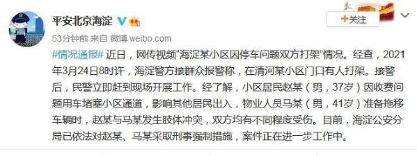 中新网3月27日电 据北京海淀公安分局官方微博消息,近日,网传视频“海淀某小区因停车问题双方打架”情况。经查,2021年3月24日8时许,海淀警方接群众报警称,在清河某小区门口有人打架。接警后,民警立即赶到现场开展工作。经了解,小区居民赵某(男,37岁)因收费问题用车堵塞小区通道,影响其他居民出入,物业人员马某(男,41岁)准备拖移车辆时,赵某与马某发生肢体冲突,双方均有不同程度受伤。