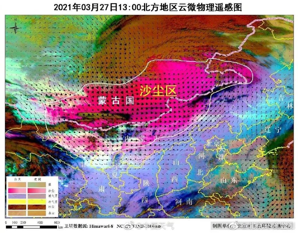 据@北京环境监测 发布的3月27日8:00-13:00北方地区云微物理遥感图可见,蒙古国南部大范围沙尘持续向东南传输,已影响我国内蒙古中部地区。