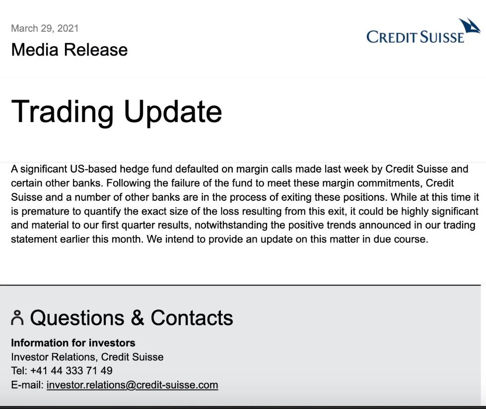 29日,瑞士信贷邮件表示,该事件导致的损失可能对第一季度财务造成“重大影响”,但量化确切的损失数据为时尚早。