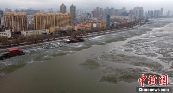 3月29日,黑龙江省哈尔滨市,松花江开始进入流冰期,大大小小的冰排,从公路大桥附近江面沿滨洲桥流下来,在松浦大桥附近江面拥挤在一起,等待下游江面融化后继续流走。图片来源:视觉中国