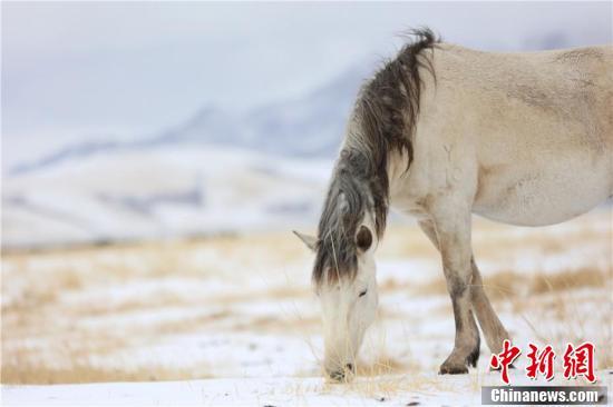 连日降雪为甘肃山丹马场披上了“白色衣裳”,马群在雪中撒欢觅食,远处的祁连山银装素裹,构成一幅雪中骏马图。王超 摄