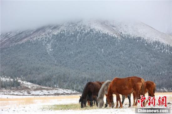 连日降雪为甘肃山丹马场披上了“白色衣裳”,马群在雪中撒欢觅食,远处的祁连山银装素裹,构成一幅雪中骏马图。王超 摄