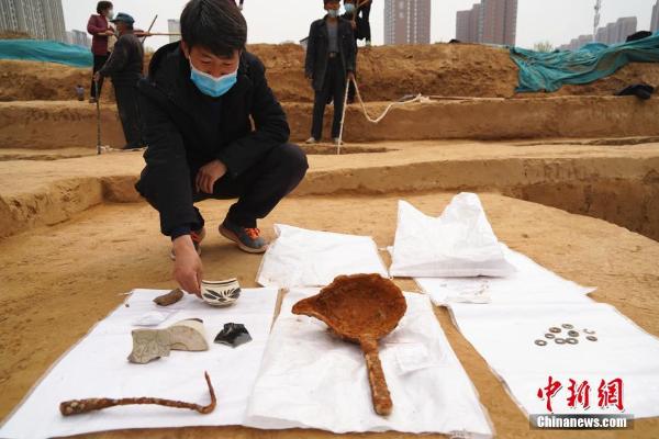 4月7日,河南郑州,古墓葬出土的部分文物。郑州市文物部门考古发掘出2座魏晋时期墓葬和2座唐代墓葬。在其中一座唐墓的墓室上方,考古人员发现了直径近1米的盗洞,盗洞内出土有元代的瓷碗、瓷罐等,考古人员推测该墓葬在元代之前就已被盗扰。四座古墓墓室内均未见有棺椁和墓主人骨,随葬品也几近盗空。中新社记者 韩章云 摄