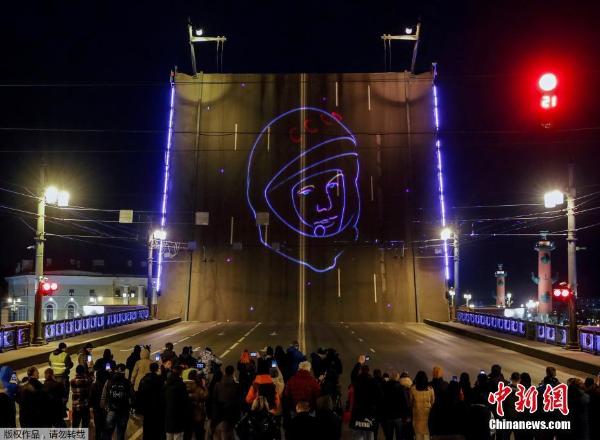 当地时间2021年4月12日,俄罗斯圣彼得堡,吊桥上投射出航天员加加林的影像,纪念人类首次载人航天飞行60周年。据报道,1961年4月12日,苏联成功发射世界上第一艘载人飞船东方一号,航天员加加林成为第一位访问太空的人类使者。