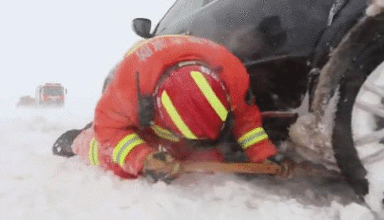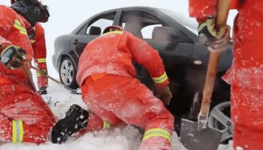 消防员到场后,为防止冷空气进入被困车辆内部,消防员让车内人员关上车窗,等待开车指令,随后用铲雪工具逐一将被困车辆附近的积雪进行清除。