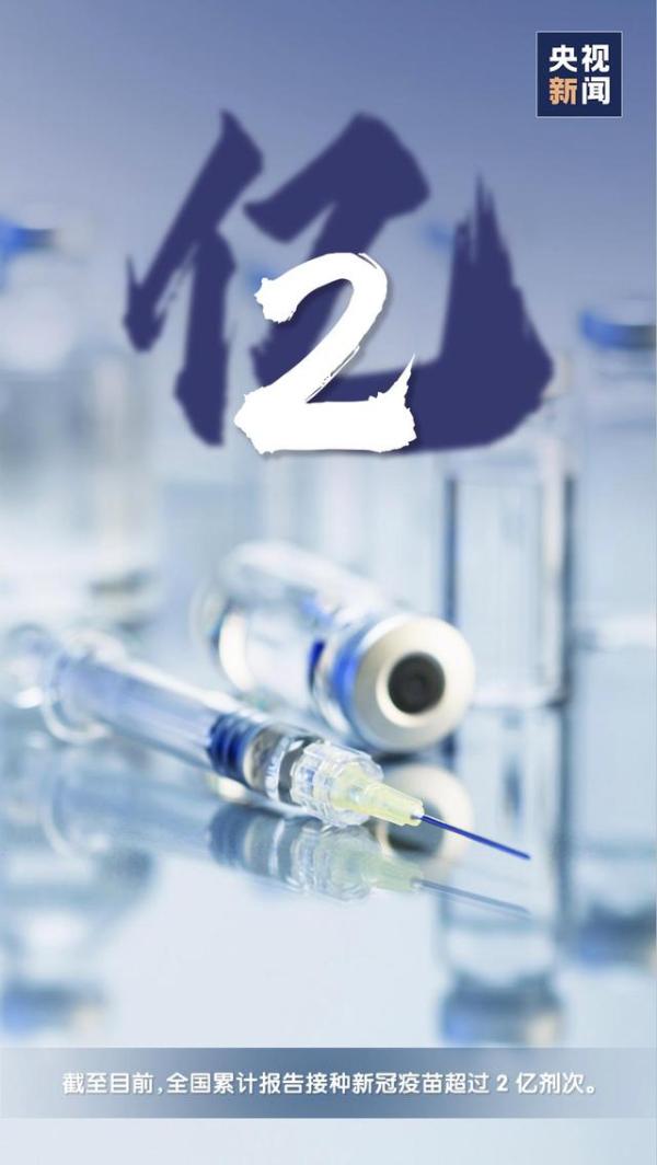 在今天(21日)下午举行的国务院联防联控机制新闻发布会上,国家卫生健康委新闻发言人米锋表示,根据刚刚收到的最新消息,截至目前,全国累计报告接种新冠疫苗超过2亿剂次。