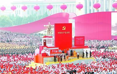 2019年10月1日,庆祝中华人民共和国成立70周年大会在北京天安门广场隆重举行。这是群众游行中的“从严治党”方阵。新华社发