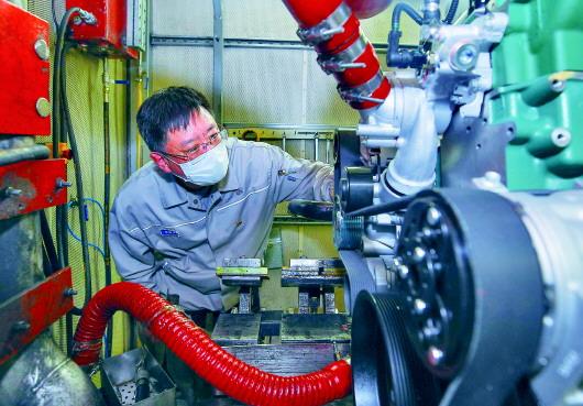 2020年5月7日,鹿新弟在车间检查柴油机的运行状况。新华社记者龙雷摄