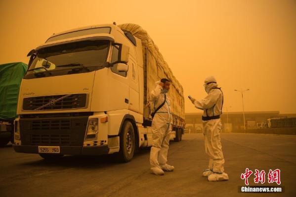 4月26日,内蒙古二连浩特市遭遇沙尘暴天气,内蒙古出入境边防检查总站二连出入境边防检查站迅速启动恶劣天气口岸通关预案,及时增派执勤警力,确保沙尘暴天气口岸通关安全顺畅。图片来源:人民视觉