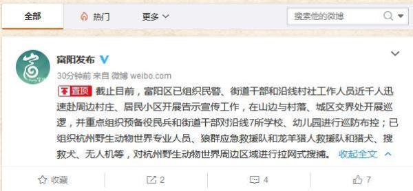 已组织杭州野生动物世界专业人员、狼群应急救援队和龙羊猎人救援队和猎犬、搜救犬、无人机等,对杭州野生动物世界周边区域进行拉网式搜捕。