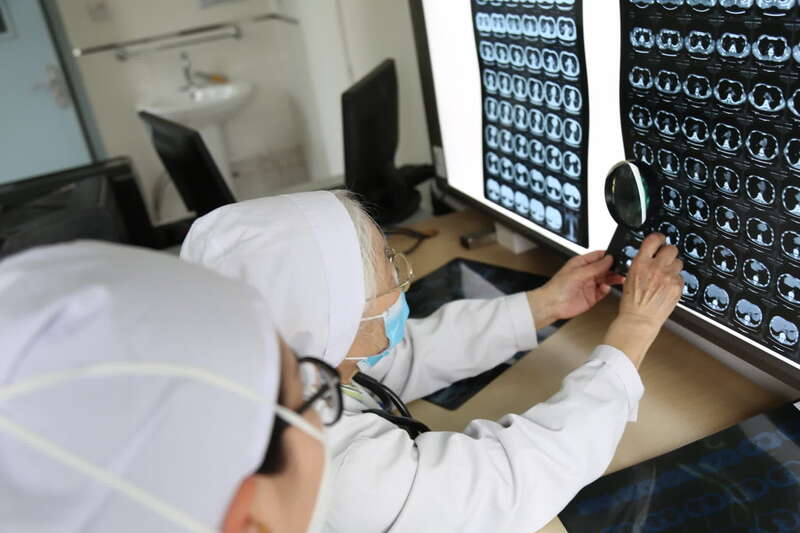 马玙看患者的CT片子时,需要用放大镜。刘昶荣/摄