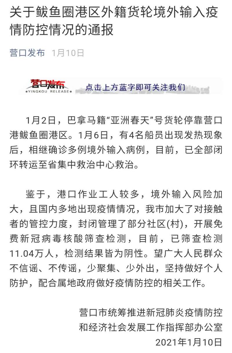 据当地卫健部门官方通报,今年1月2日,巴拿马籍“亚洲春天”号货轮停靠营口港鲅鱼圈港区。1月6日,有4名船员出现发热现象后,相继确诊多例境外输入病例,当地通报称,鉴于港口作业工人较多,境外输入风险加大,营口市加大对接触者的管控力度,封闭管理了部分社区(村)。