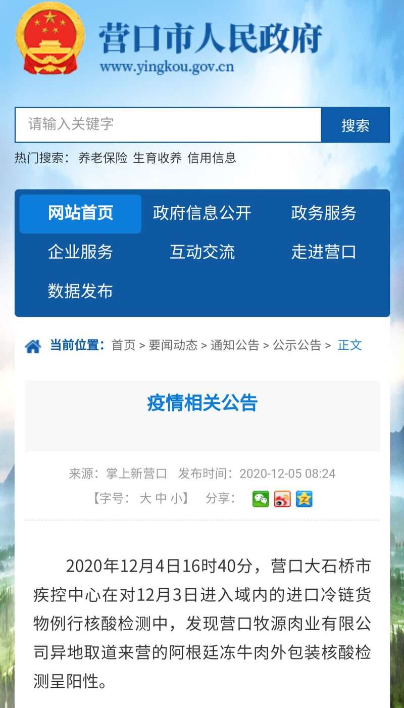 2020年12月4日,营口大石桥市疾控中心在对12月3日进入域内的进口冷链货物例行核酸检测中,发现营口牧源肉业有限公司异地取道来营的阿根廷冻牛肉外包装核酸检测呈阳性。