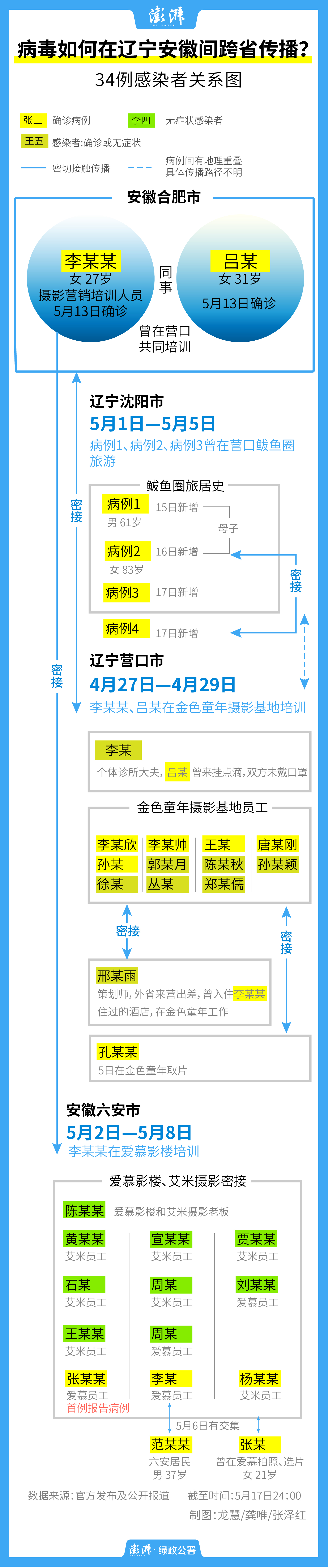 截至5月17日24时,5天来,辽宁、安徽此轮本地疫情已新增34例新冠感染者,其中辽宁省18例,安徽省16例。