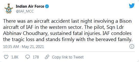 印度空军在社交网站上表示:“印度空军的一架战机在西部发生了事故。飞行员乔杜里受了致命伤。印度空军对这一悲剧表示哀悼,并坚定地与遇难者家属站在一起。”