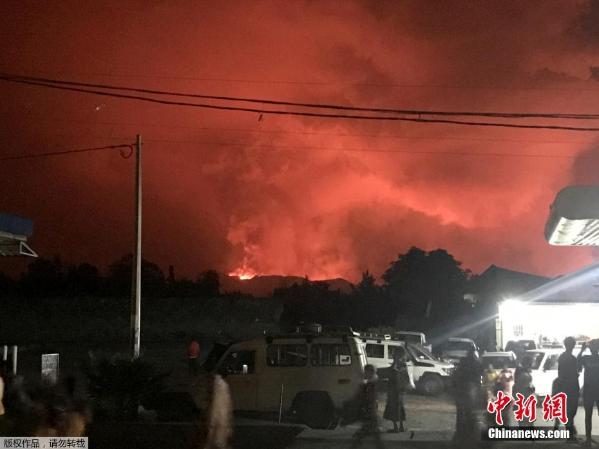 当地时间5月22日,位于刚果民主共和国的尼拉贡戈火山喷发,烟雾和火焰“染红”天空。图为从远处居民区眺望火山。