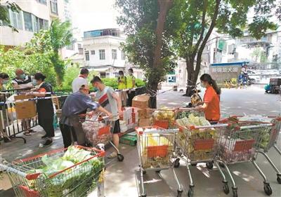 记者从越秀集团获悉,自接到结对任务起,越秀集团旗下风行生鲜通宵达旦开展调货和备货工作,至29日早上,越秀集团共派出35人支援东漖街,在芳村花园、金昊大厦等6处临时设便民点保供应。从29日凌晨起,15台车配送生鲜货物,安排排骨、瘦肉、五花肉、菜心、生菜、番茄等二十个品种,肉品约2.5吨,蔬菜7吨供应,确保荔湾区市民正常生活的供应。