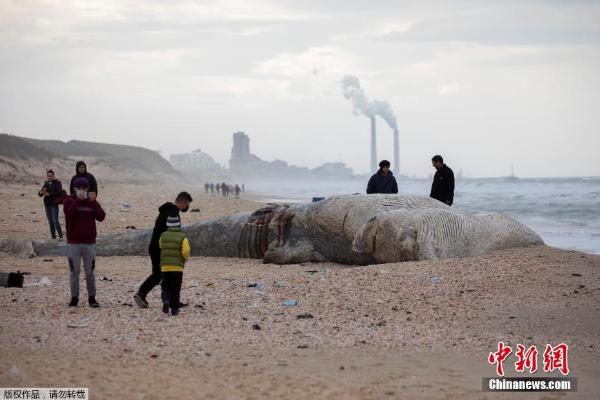 当地时间2021年2月19日,在以色列尼扎尼姆附近,人们站在一条从地中海冲上岸的鲸鱼尸体旁。