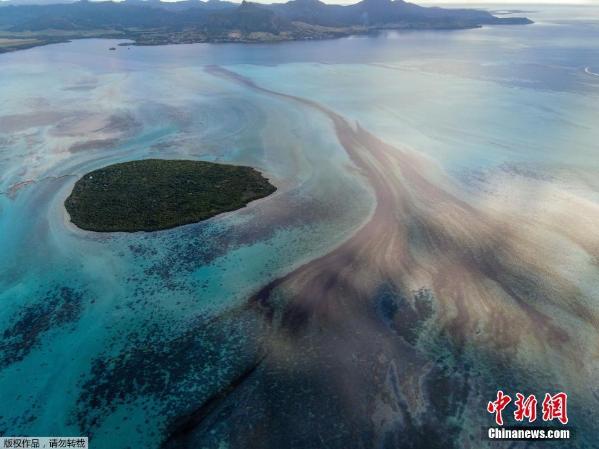 当地时间2020年8月8日,毛里求斯岛,航拍被石油污染的野生动植物保护区埃斯尼角。7月25日,日本货船在当地撞上了珊瑚礁,船上石油泄露。