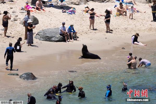 美国加州旅游业复苏 海狮与游客共享阳光沙滩