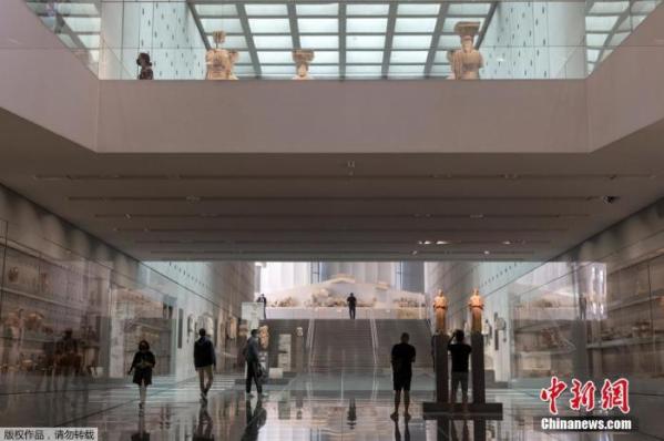 资料图:当地时间2021年5月14日,希腊雅典,雅典卫城博物馆重新向公众开放。图为游客在博物馆内游览。