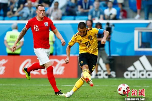 2018年世界杯,比利时2:0战胜英格兰,获得历史突破第三名。图为阿扎尔起脚。中新社记者 富田 摄
