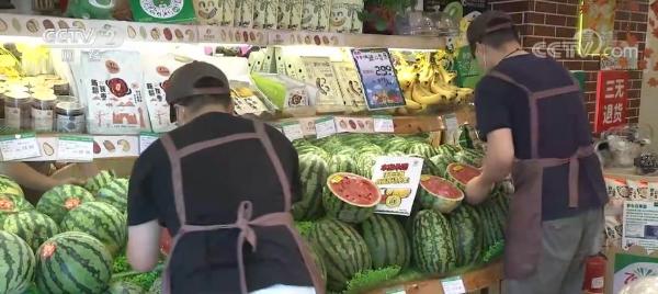 记者在北京一家水果连锁门店看到,工作人员正在将刚刚采购的西瓜、葡萄、桃子等鲜果摆上货架。负责人杨文凤告诉记者,6月份至今,北方时令鲜果和南方热带水果均进入上市高峰期,水果供应数量充足、品种丰富。