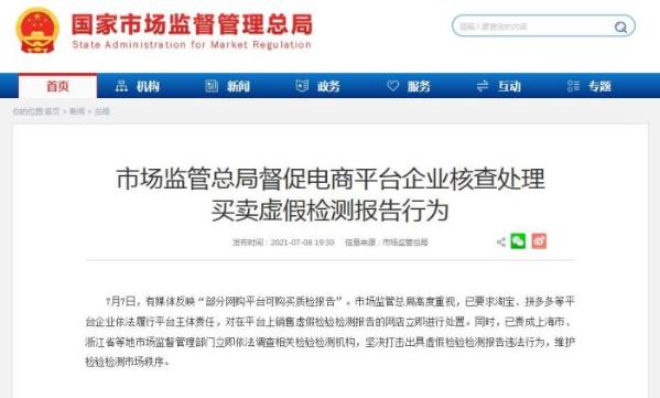 中新网7月8日电 据国家市场监管总局网站消息,7月7日,有媒体反映“部分网购平台可购买质检报告”。市场监管总局高度重视,已要求淘宝、拼多多等平台企业依法履行平台主体责任,对在平台上销售虚假检验检测报告的网店立即进行处置。同时,已责成上海市、浙江省等地市场监督管理部门立即依法调查相关检验检测机构,坚决打击出具虚假检验检测报告违法行为,维护检验检测市场秩序。