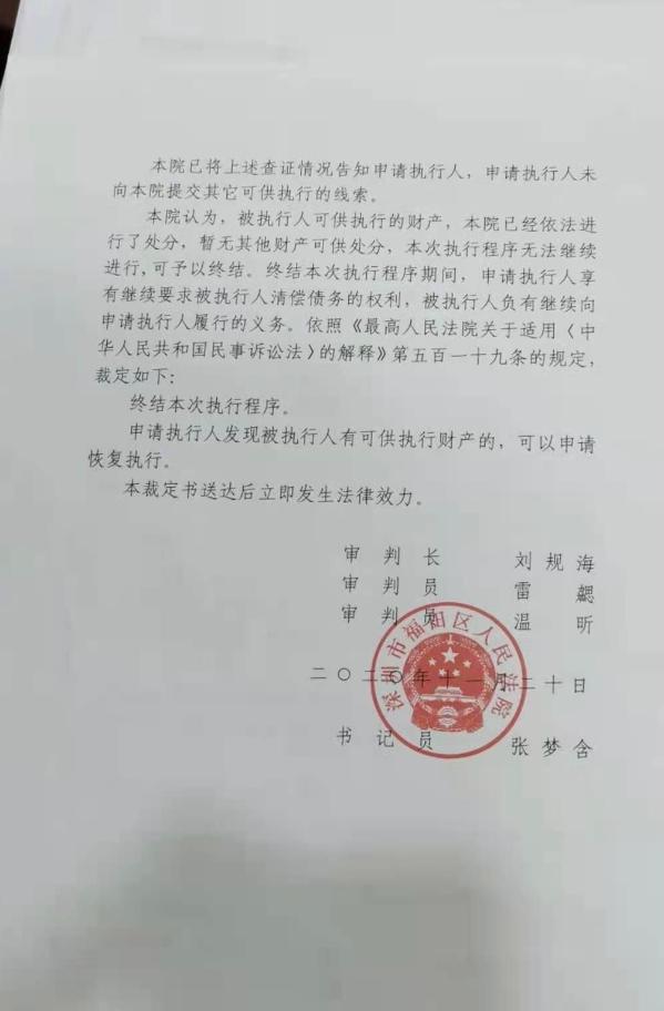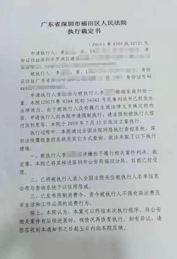 福田法院此前做出的执行裁定书显示,李某勇涉拒执罪被移交公安后,法院决定终结本次执行程序,待公安相关案件有后续进展时,视情况再恢复执行。