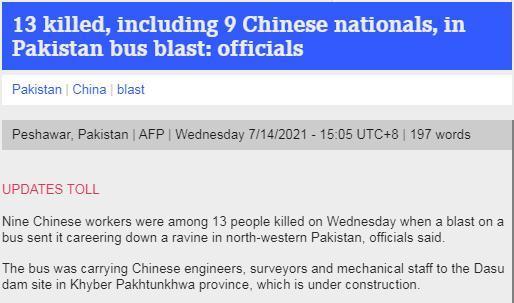 据此前报道,消息人士称,这辆巴士当时载着30多名人员,其中许多人是中国籍工程师,当时正前往巴基斯坦上科希斯坦的达苏水电站工地。