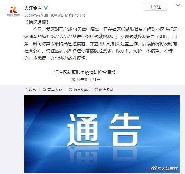 中国青年网北京8月21日电 据武汉市江岸区官方微博消息,今日,江岸区对已完成14天集中隔离、正在辖区后湖街道东方明珠小区进行居家隔离的境外返汉人员冯某进行例行核酸检测时,发现核酸检测结果呈阳性,已第一时间对其采取隔离管控措施,并立即启动相关处置工作,后续情况将及时向社会公布。