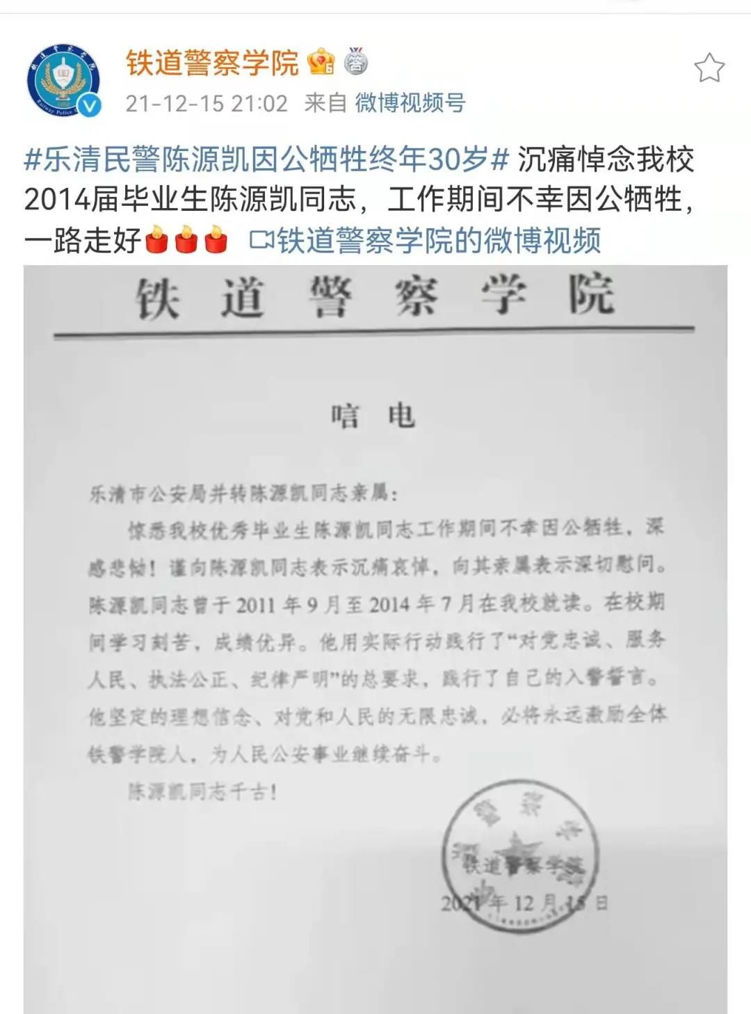 12月14日,浙江省乐清市公安局大荆派出所副所长陈源凯在单位工作期间突发疾病,因公牺牲,年仅30岁。