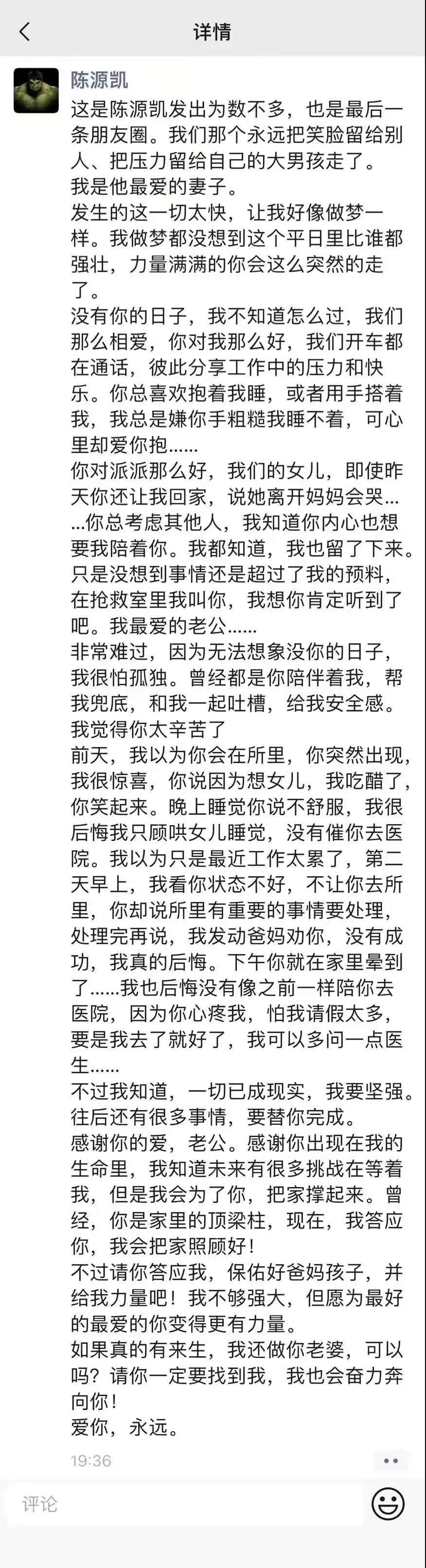 “这是陈源凯发出为数不多,也是最后一条朋友圈。我们那个永远把笑脸留给别人、把压力留给自己的大男孩走了,我是他最爱的妻子……”