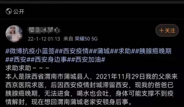1月12日凌晨1时许,微博平台上出现了一条求助信息:“我是渭南市蒲城县人,2021年11月29日,父亲来西安求医,后因疫情滞留。现在父亲已癌症晚期,无法进食,身体可能支撑不到解封时间,想回蒲城老家安顿后事。”求助人原女士的地址,位于西咸新区所辖王寺街道管内。