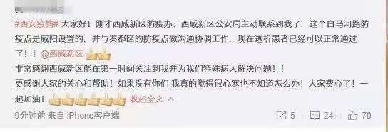 原来,正是原女士的一条求助微博,引发了一场爱心接力——在陕西省西咸新区工作人员的一次次沟通、协调下,原女士这个外乡人在疫情中的西安感受到了冬日里的温暖。