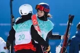自由式滑雪女子大跳台资格赛结束,谷爱凌(右)与另一位中国选手、年仅18岁的杨硕瑞相拥,后者因伤发挥欠佳,未能进入决赛。视觉中国供图