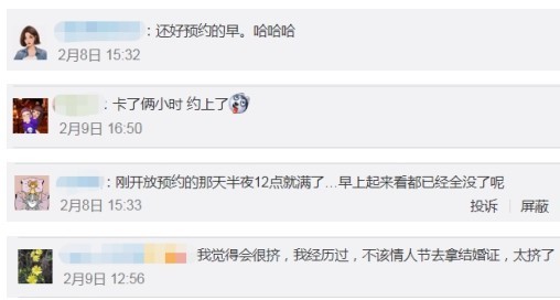有打算领证的新人现身说“法”,“还好预约的早”“卡了俩小时!约上了”“刚开放预约的那天半夜12点就满了”……不过也有过来人友情提示,“我经历过,不该情人节去拿结婚证,太挤了!”