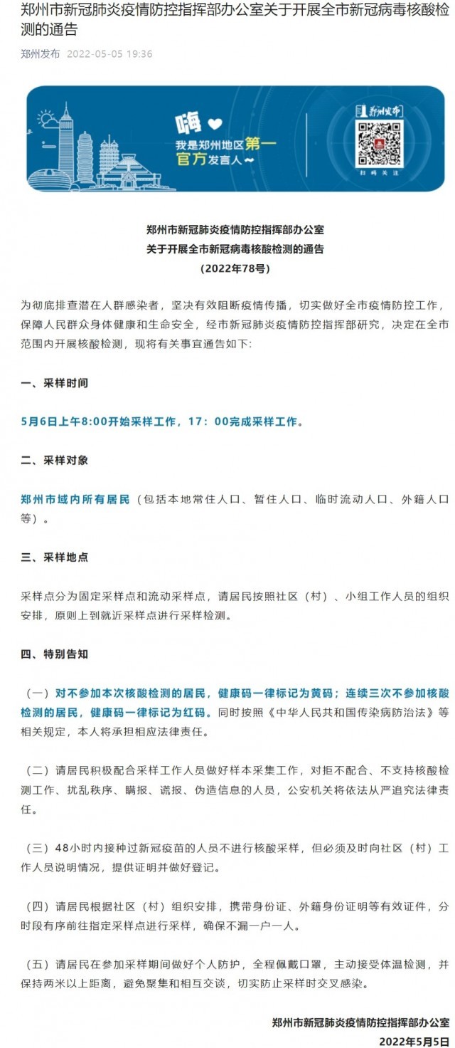 据“郑州发布”微信公众号5日消息,河南郑州发布78号通告,5月6日在全市范围内开展核酸检测。以下为全文: