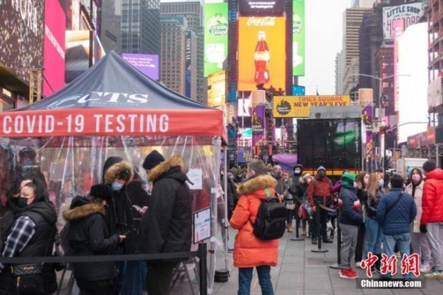 当地时间2021年12月29日,美国纽约,民众在时报广场的一处新冠病毒检测点排队检测。 中新社记者 王帆 摄