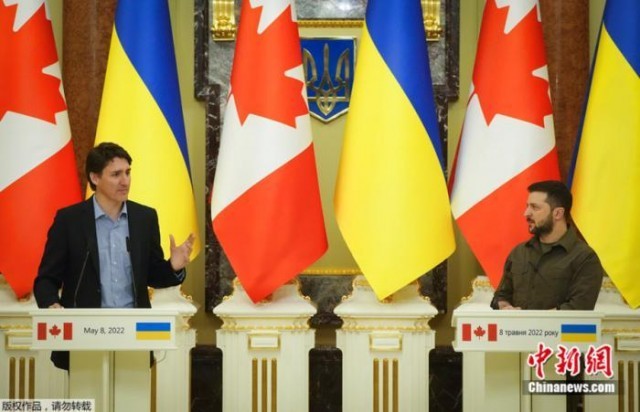 当地时间5月8日,加总理特鲁多和乌总统泽连斯基在基辅会晤后出席新闻发布会。